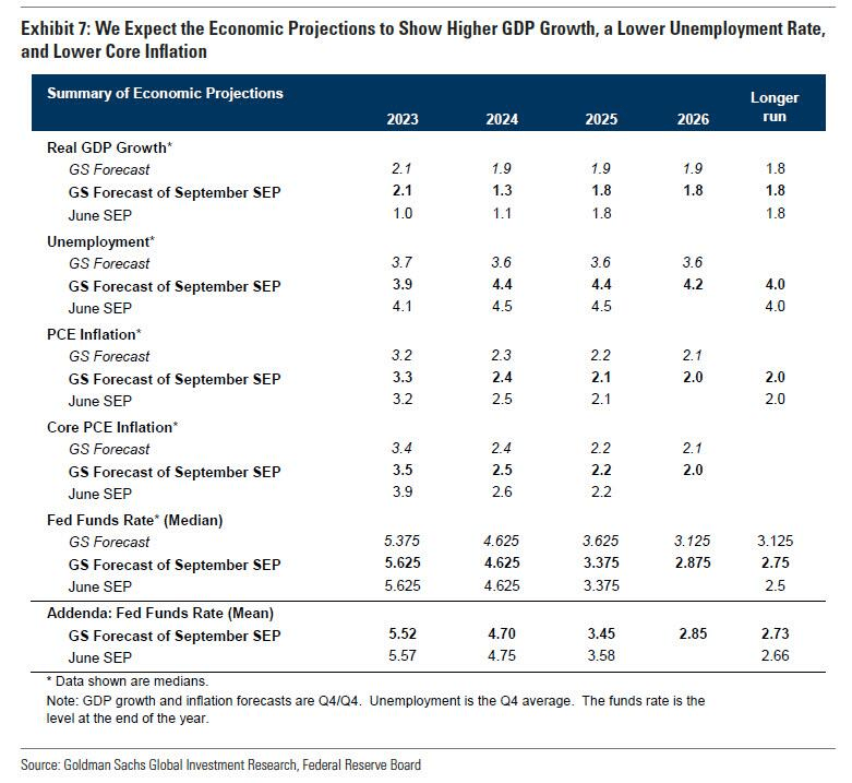 The median of indications will show that policymakers expect a decline in the benchmark rate of as little as 50 basis points or 75 basis points for 2024, compared with the 100 basis points their plot showed in June. I expect the Fed to leave its dot plot for 2023 intact, with the funds rate indicated at 5.6%.