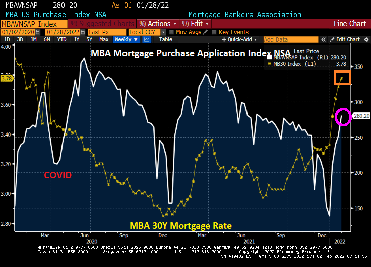 But the housing market is still blistering hot in January 2022. Mortgage Bankers Association (MBA) mortgage purchase applications for the week of 1/21-1/28 were UP 11.63% week-over-week (WoW).