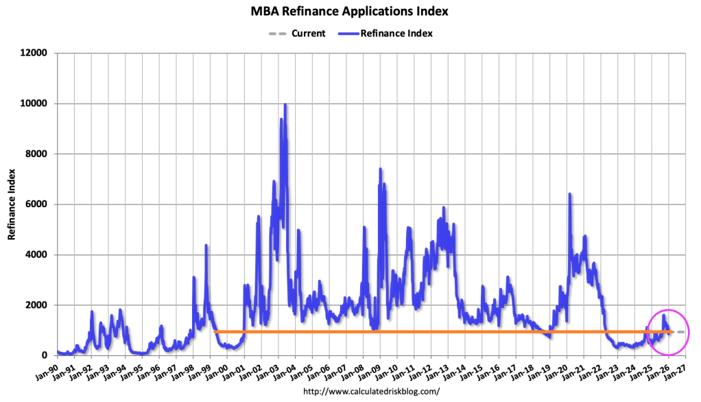 Mortgage applications decreased 9.7 percent from two weeks earlier, according to data from the Mortgage Bankers Association’s (MBA) Weekly Mortgage Applications Survey for the week ending January 2, 2026. The results include an adjustment for the holidays.