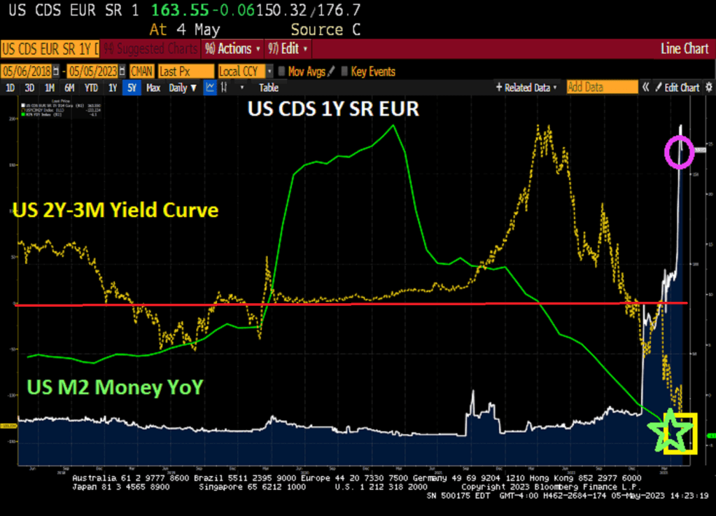 Meanwile, the US credit default swap remains elevated as the US Treasury short curve (2Y-3M) is near the most inverted in history.