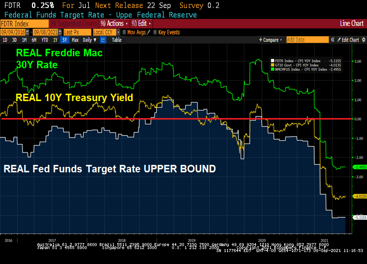 As the 10-year Treasury yield remains repressed DESPITE HIGHEST INFLATION RATE SINCE 2008, the Freddie Mac 30-year mortgage rate remains repressed as well. Yes, that mean NEGATIVE REAL MORTGAGE RATES.