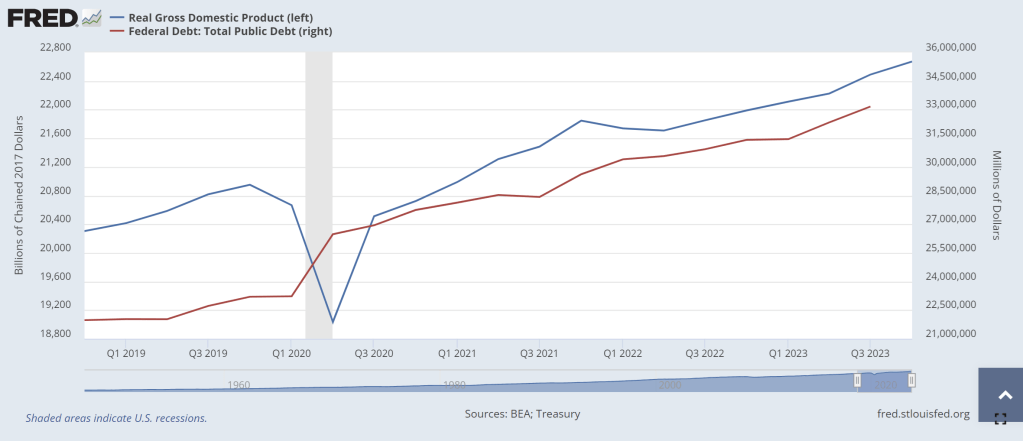 Yes, the US is borrowing like the proverbial drunken sailor while they “invest” in green energy, wars in Ukraine and the Middle East, and massive social welfare programs (like the old breads and circuses from the dying Roman Empire). When watching the media’s obsession with Taylor Swift and Chief’s Tight End Travis Kelce at The Super Bowl, it reminded me of “Breads and Circuses” as our nation is collapsing like a dying star. (That is why I Iike Gold, Silver and Bitcoin!)