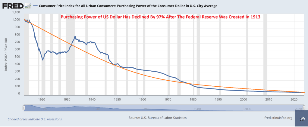 What about The Federal Reserve? It was created in 1913 after signed into existence by President Woodrow Wilson. Since The Fed’s inception, consumer purchasing power has declined by 97%.