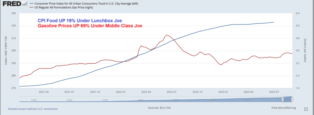 CPI food prices are up 19% under “Lunchbox Joe” and up 69% under “Green Joe”. True, the American middle class is far worse off under Bidenomics, but it is all about marketing Bidenomics at this point.