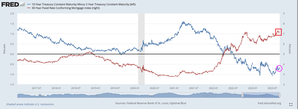 But back in the USA (while Biden does his humiliate the US tour of Vietnam, India, etc, and ignores the tragedy of the 9/11 attacks), we see mortgage rates still up above 7% as the US Treasrury 10Y-2Y yield curve