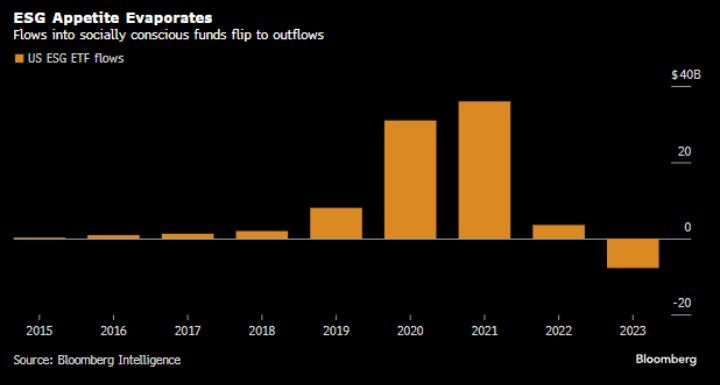 But all is not well with WEF’s ESG drug distribution. In fact, ESG flows into socially consious funds were a big thing during Covid (2020) and the first year of Biden’s Reign of Error. But ESG flows slowed sharply in 2022 and seeing net outflows in 2023.