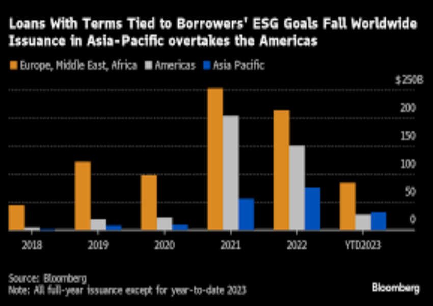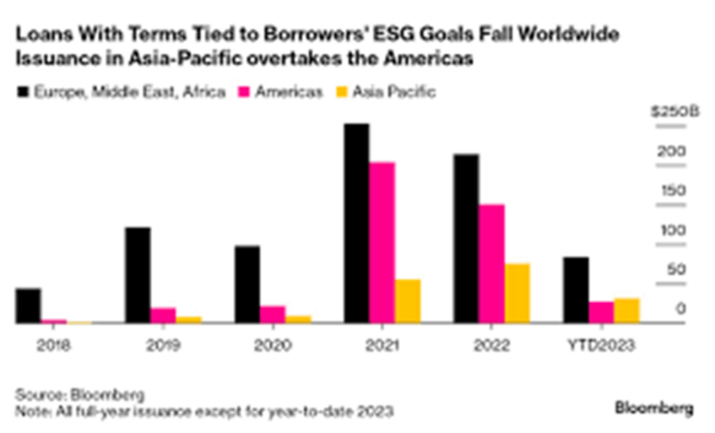 But ESG is still relatively popular in Europe, Middle East and Africa (orange). But taste for ESG is waning around the globe. But the selection of Biden as President in the US marked a surge in ESG -tied loans in 2021 and 2022 (not to mention the insane levels of spending out of Biden and Congress, much tied to the sustainability, green energy fantasy.