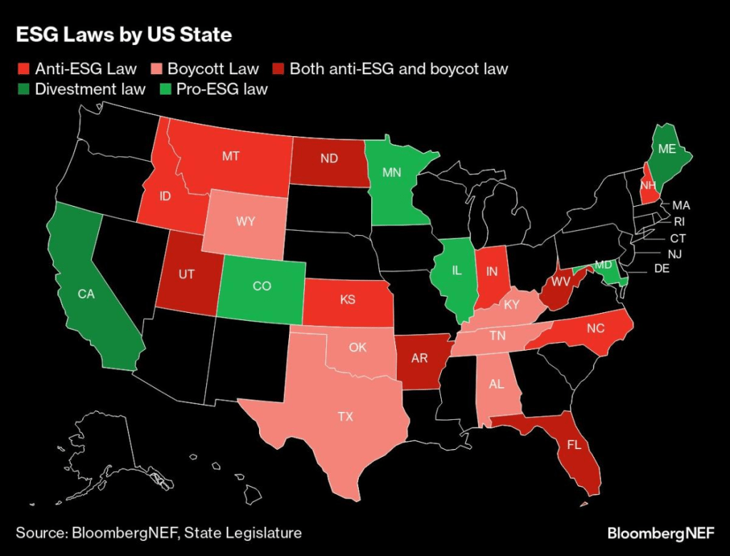 Several states (largely blue states like California, Minnesota, Illinois, and Colorado have pro-ESG laws) while several states have anti-ESG laws (largely red states like Montana, Idaho, North Dakota, Kansas, Utah, Indiana, Arkansas, Florida, and West Virginia).