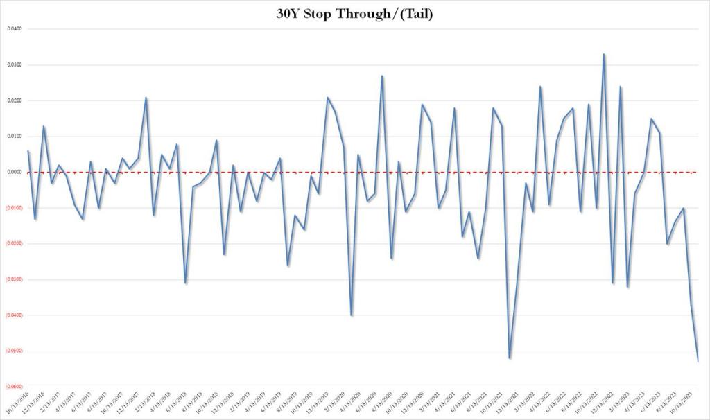 The bond priced at a high yield of 4.769%, which was below last month’s 4.837%, and just shy of the April 2010 high. But more importantly, it tailed the When Issued by a whopping 5.3bps, which was… well… terrible, because as shown in the chart below, this was the biggest tail on record (going back to 2016).