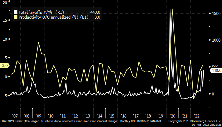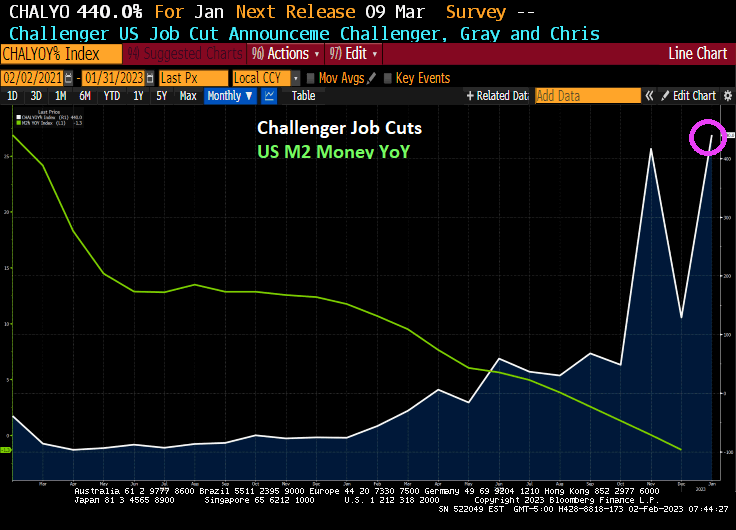 In January, the Challenger, Gray and Christmas jobs cuts index was a doozy. Jobs cuts rose 440%. This is happening as The Federal Reserve keeps its feet on the monetary brake pedal.