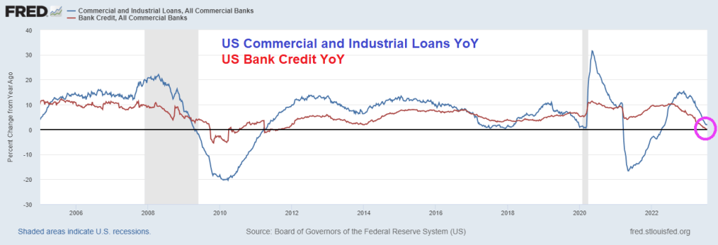 So, how is Bidenomics working out? On the bank lending front, commercial and industrial (C&I) lending growth is crashing along with bank credit growth YoY.