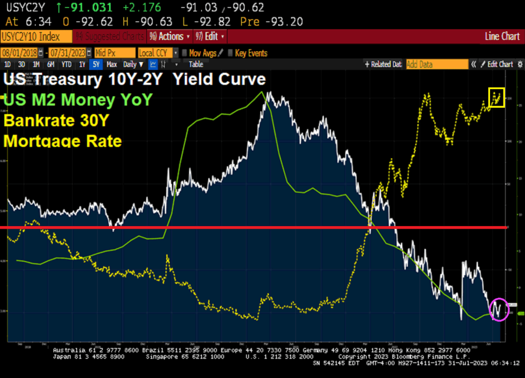 The US Treasury 10Y-2Y yield curve remains deeply inverted at -91.031 basis points and M2 Money growth has crashed. The 30 year mortgage rate is hovering around 7.27%.