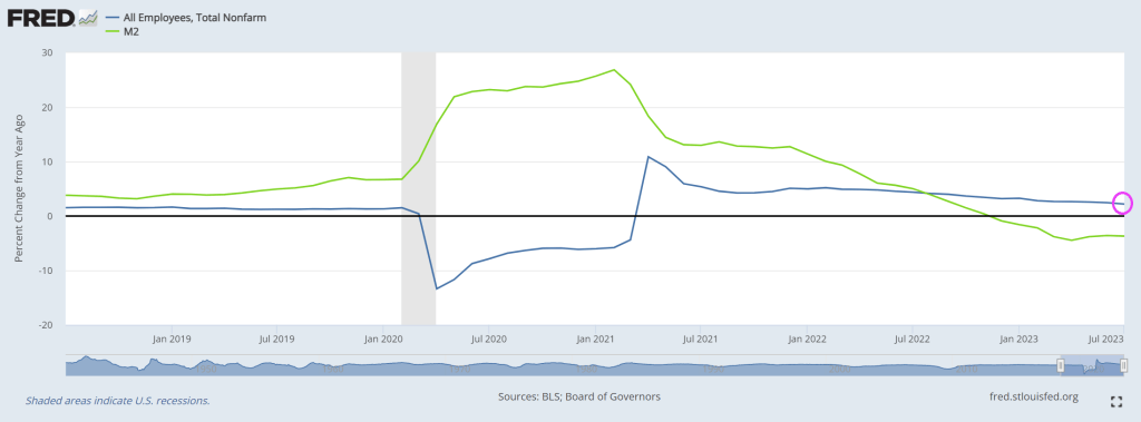 Even without the revision, job growth has slowed to 2.2% YoY in July as M2 Money growth slowed to -3.7% YoY.