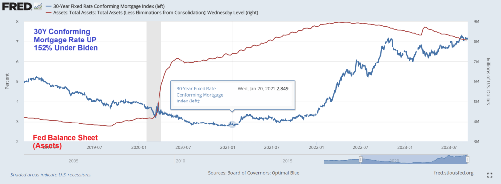 Mortgage rates are up 152% under Biden’s Reign of Economic Error. Note the big assist the economy got from Covid-related Fed stimulus (red line). The Fed’s balance sheet is still over $8 trillion.