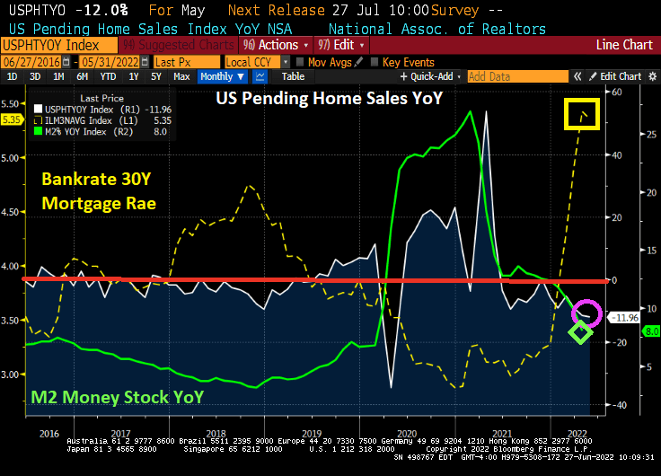 US pending home sales declined -12% YoY in May as The Fed cranked up mortgage rates. That was 11 out of the last 12 months had declining pending home sales.