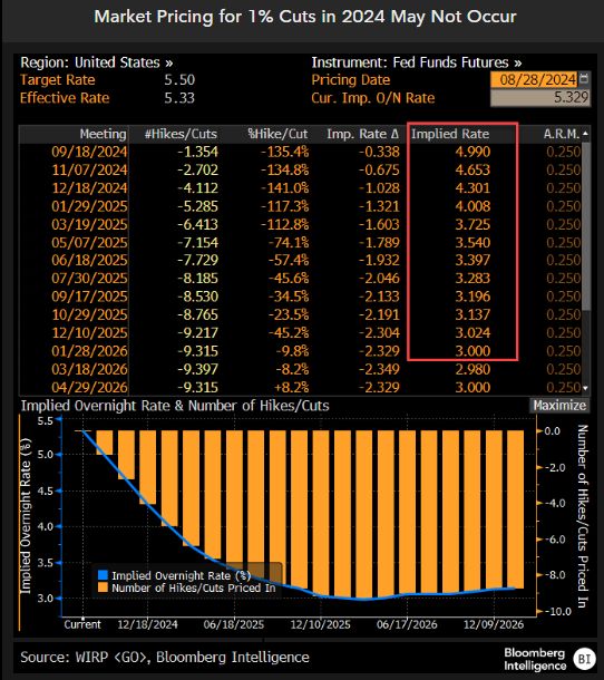 First, market participants are pricing in nearly 250 basis points (or 2.5%) in rate cuts by Jan 2026. Down to 3% from the cuurent rate of 5.50.