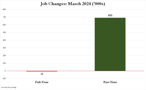 For those wondering if the jobs were all part-time, the answer is a resounding yes: in March, full-time jobs dropped by 6,000 as Part-time jobs soared by 691,000.