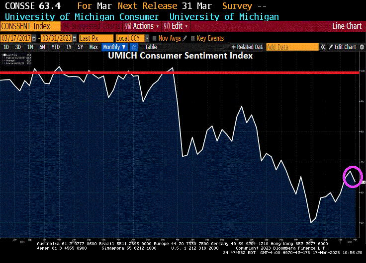 US consumer sentiment fell again … and has not been near 100 (baseline) since Covid struck.