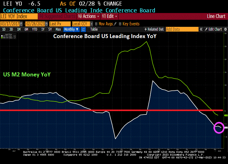 Apparently, the only thing that is strong in the US economy is low-paying jobs. The economy as a whole is sucking wind as we can see with the Conference Board’s Leading Indictors plunging -6.5% Year-over-year (YoY) in February.