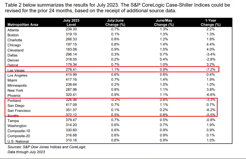At the metro level, Las Vegas leads in YoY price declines at -7.2%. In a close second is San Francisco at -6.2%. Portland and Seattle also declined.