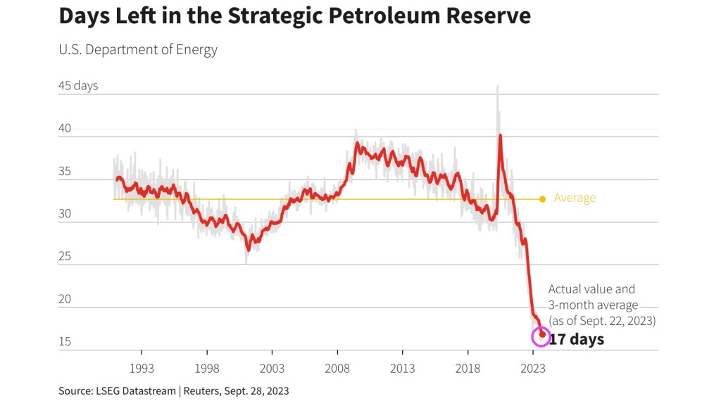 On the energy front, where we are represented by former Michigan governnor Jennifer Granholm and former South Bend Indiana mayor Pete Buttigieg, we see that the Strategic Petroleum Reserve is down to only 17 days left.
