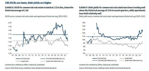Looking at different debt metrics, DSCR for commercial real estate (office, industrial and retail combined) tracked at 1.52 in Dec, below the historical average of 1.69; debt yields for commercial real estate have been trending well above the historical average of ~11% in recent quarters, while apartments have held relatively well.