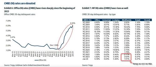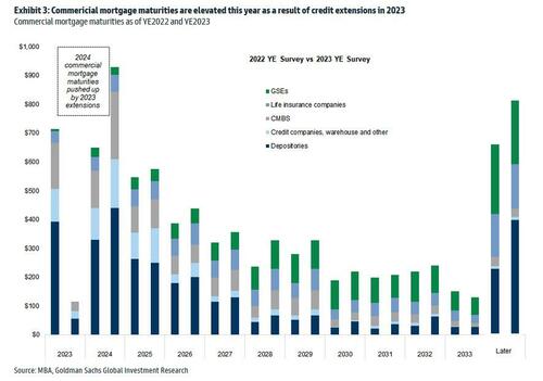 Of course, it does not end there, and since there has been no fundamental improvement, it is certain that extension volumes in 2024 will be high as well. However, as interest rates are expected to come down, demand for refinancing in 2024 may outpace that in 2023 according to the Goldman analyst (rates are still far, far higher than where they were when most of the loans were originated several years ago). At the same time, for loans that have already been extended in the past, it is also likely that future extensions could be harder.