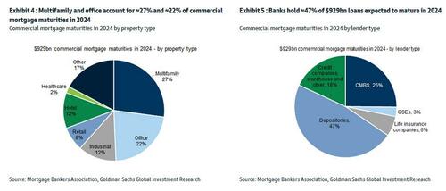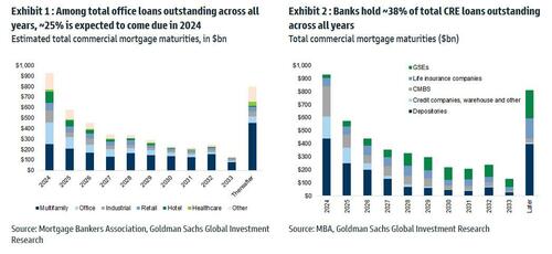 For one answer, we turned to the latest report from Goldman’s REIT/CRE expert Chandhi Luthra who has published a visual assessment of the state of CRE in 2024 in terms of loan maturities, 2023 extensions, and property and lender groups. She also looks at the latest transaction and leasing volumes, and shares several key takeaways.