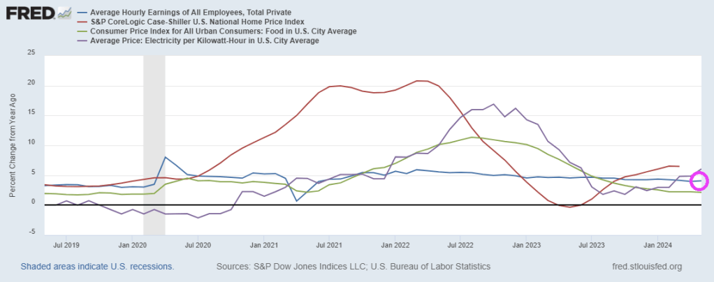 Yellen brags about rising wages and declining inflation. Well, average hourly earnings YoY are now 4.1%. However, home prices are growing at 6.5% year-over-year (YoY) and electricity prices are up 6.1% YoY. Food CPI grew at 2.1% in May. Yellen ignores the string of 10%+ increases in 2022-2023 making eating unaffoprdable for millions.
