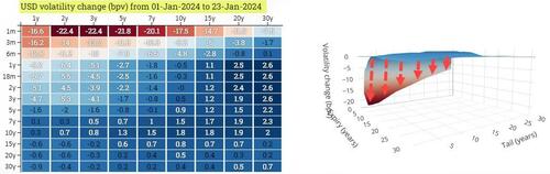 As he notes, the “dovish-trifecta” right-tail repricing has gotten us to ~4900… and, he says, the actual “realization” could then certainly push us through 5000:It’s my expectations that we could very well see:1) “March Fed cut” to pick-up Delta again after what is expected to be a “light” core PCE print this Friday…and taking back pricing following the past week’s Fed speak pushback and “too resilient” Labor- and Consumer- data, which has driven March Fed meeting “cut” probabilities being sliced in half over the past one week (~80% on 1/12/24 to today’s ~40%)The next potential dovish catalyst is 2) the QRA est / announcement end of Jan / start Feb, with “binary risk” implications on the direction of Duration and Risk-Assets, as the market generally anticipates resumption of larger Coupon issuance from the US Treasury ahead—but what if there is one final announcement where Bills stay high, Coupon increases but isn’t as large as most anticipate, AND Yellen signals that this is the final expected Coupon increase?!