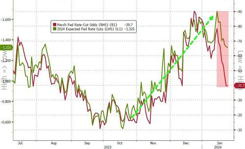 So, be careful what you wish for from higher and higher all-time-highs for stocks – the stronger they look (on the back of dovish expectations), the more likely The Fed is to hold back the actual dovish actions so much hope is founded on.