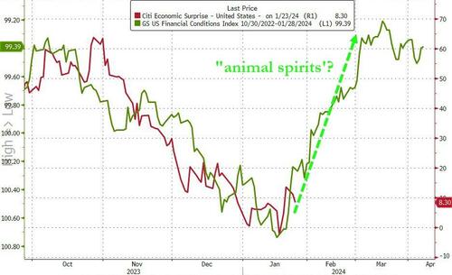 Outside of “Mag 7” guidance disappointments, I believe the next worst-case scenario for current positioning in Stocks would be an “Animal Spirits” US data reacceleration which forces the above “dovish trifecta” off-course and blows-out the recently calming “Fed Rates path” distribution again:Why would resumption of better US growth data negatively impact US Equities consensus thematic / singles positioning?Because after the 4Q23 de-grossing of short books and forced “Net-up” to stop the bleed and chase (massive squeeze & cover in low quality / cyclical value / leveraged balance sheet / high short interest “junk”)….2024 YTD has instead seen the market reset the prior “Momentum” regime of “Long Quality / Size / Secular Growth” i.e. MegaCap Tech, while re-shorting that economically-sensitive “low quality / junk” stuff againIn a world of slowing but positive growth to 2% GDP and now with 3m inflation annualizing sub 2% target…you go back to that “QE of old” 2010s -decade playbook of “long stuff that can grow earnings and profits without needing a hot economic cycle”…i.e. long quality, size (liquid) & secular growth / short leverage & cyclical valueBut IF we see the “animal spirits” data reacceleration off the back of the massive FCI easing that the Fed and Treasury have facilitated, plus the persistent wage growth and still too strong labor meaning consumption remains robust, along with ongoing govt fiscal stim / spending…