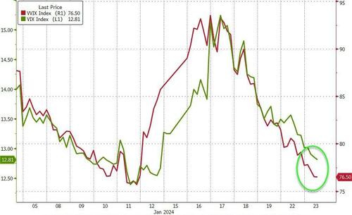 This “dovish-trifecta” is the macro catalyst behind the “right-tail” scenario which has appropriately been repriced higher by the market over the course of the past month, and we’ve seen clients allocate some protection spend to this “crash-UP” scenarioAnd again, IF the above were to realize… without negative catalysts (Earnings fine, no further Rates selloff / Fed repricing, continued disinflationary trajectory rebuilds “Fed cut” implied probability) around that upcoming Feb VIXpery with all that Dealer “short VIX Calls” positioning being hedged… there is absolutely potential for an Equities slingshot if there are no issues and those customer “Long VIX Calls” bleed-out, which will mean Dealers puke out their UX1 Longs (as hedges) back into the market for a potential “kicker” to goose Spot Equities even higher…For now, no-one is worried about downside based on VVIX being back near post-COVID lows…