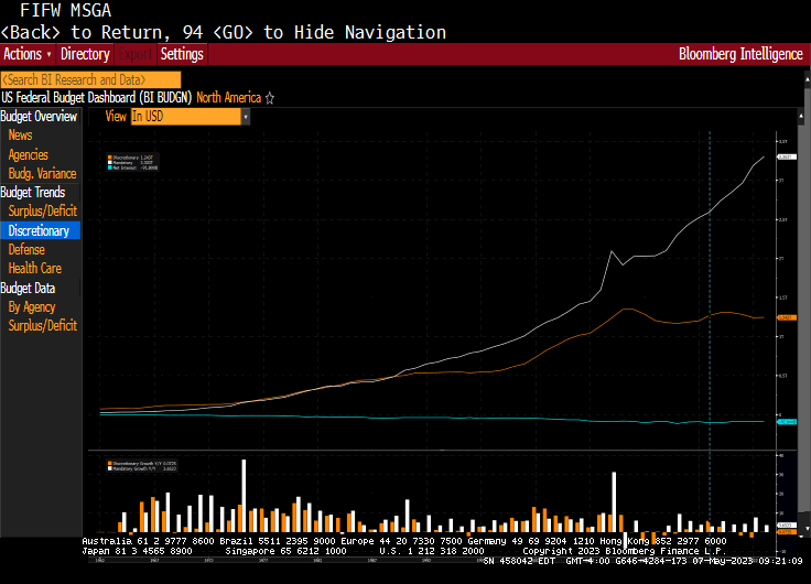 Mandatory spending is expected to soar while discretionary spending is almost flat in terms of growth.