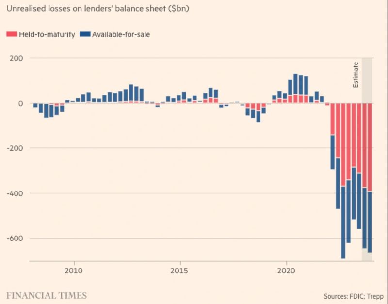 Paper losses on the most opaque part of US banks’ bond portfolios are now close to $400bn — an all-time high, and 10 per cent above the peak at the start of the year that caused the collapse of Silicon Valley Bank.