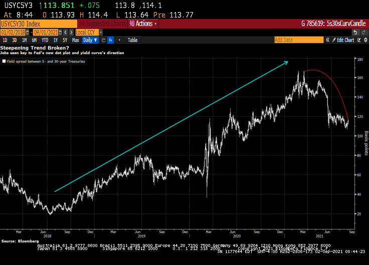 The upshot is that a robust reading Friday could have investors pulling forward tightening bets regardless of Powell’s efforts last week in his virtual speech at the Fed’s Jackson Hole symposium. The risk is traders will prepare for a repeat of June, when a hawkish signal via the dot-plot took markets by surprise and triggered an abrupt unwinding of wagers on a steeper yield curve.