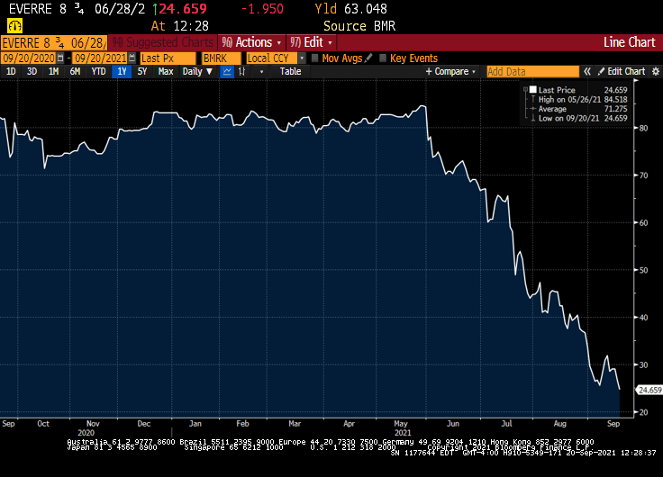 OK, liquidity isn’t as bad as COVID and March 2020, but it is near the highest level since March 2020. The question is … will the numerous asset bubbles around the globe burstLet’s look at the ongoing saga of Chinese conglomerate Evergrande (mainly known as a large real estate developer). Their 8.25% bond has plunged to $23.481 on speculation of a catastrophic default on their bond payments. Then we have Invesco’s Golden Dragon China ETF (measuring a diversified market cap of US-listed companies headquartered or incorporated in China & derive a majority of their revenues from the People’s Republic of China). This ETF has crashed and burned back to pre-COVID (and Stimulytpo) levels.