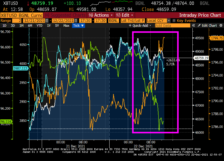 The US dollar (green) fell when Powell opened his pie-hole. But Bitcoin (blue) fell in advance as if they knew what Powell was going to say.
