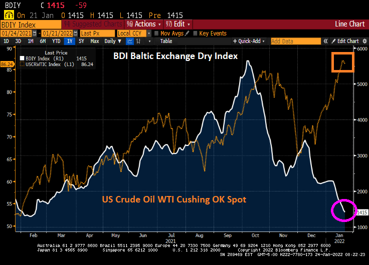 The Baltic Dry shipping cost index indicates that costs for shipping materials such as iron ore have decline to where it started under Biden, despite West Texas Crude Oil spot prices begin considerably higher thanks to Biden’s anti-fossil fuel policies.