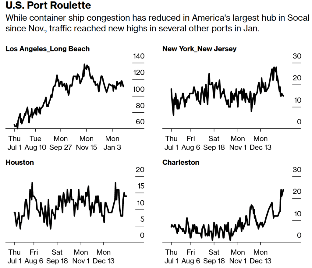 Port traffic tracked by Bloomberg shows container congestion continues to rankle the U.S. supply chain from Charleston, South Carolina, to the West Coast. The tally of ships queuing for the neighboring gateways of Los Angeles and Long Beach, California, continued to extend into Mexican waters, totaling 111 vessels late Sunday, nearly double the amount in July.