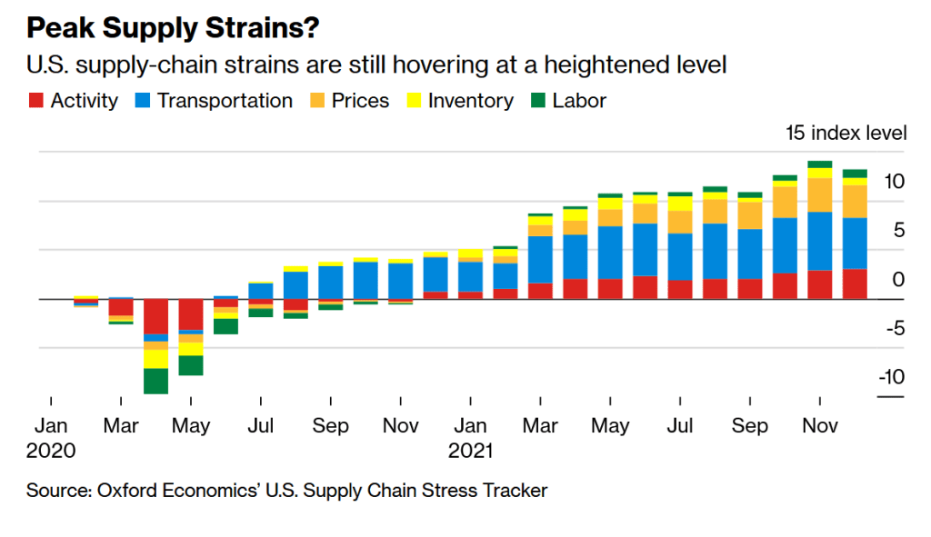 Bloomberg Economics’ latest supply constraint index for the U.S. shows that shortages have trended modestly lower for six months. Even so, strains remain elevated, and the wave of worker absenteeism is adding to the problems at the start of 2022.