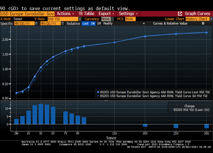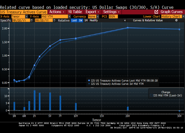 Anyway, Treasuries ended mixed Wednesday with the yield curve sharply flatter after a raft of U.S. economic data and minutes of the November FOMC meeting bolstered expectations for an earlier start to Fed rate increases. Two- and 5-year yields reached YTD highs, and 5s30s spread reached narrowest since March 2020.
