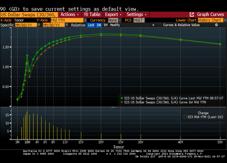 The US Dollar Swaps curve shows the same dynamics. The dark blue line is last Wednesday, while the remaining lines are last Friday, this Monday and today. Not a lot happening after the initial Omicron fear factor was priced in.