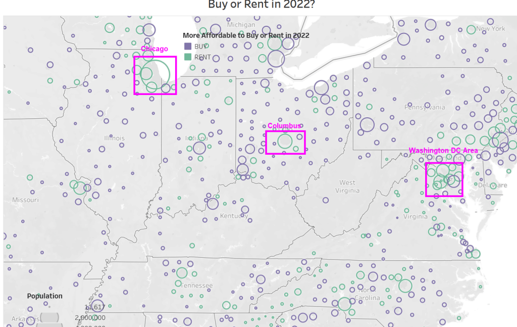 You will notice that the areas where buying is more affordable than renting tend to be smaller towns with slower growth, while larger cities tend to be more affordable to rent.