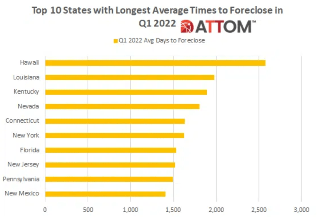 Speaking of a magic trick, here is how government’s make the average time to foreclosure up to over 7 years in Hawaii and 4.4 years in New York. In simple terms, you can buy a home in New York, never make a mortgage payment and live rent free for an average of 4.4 years.