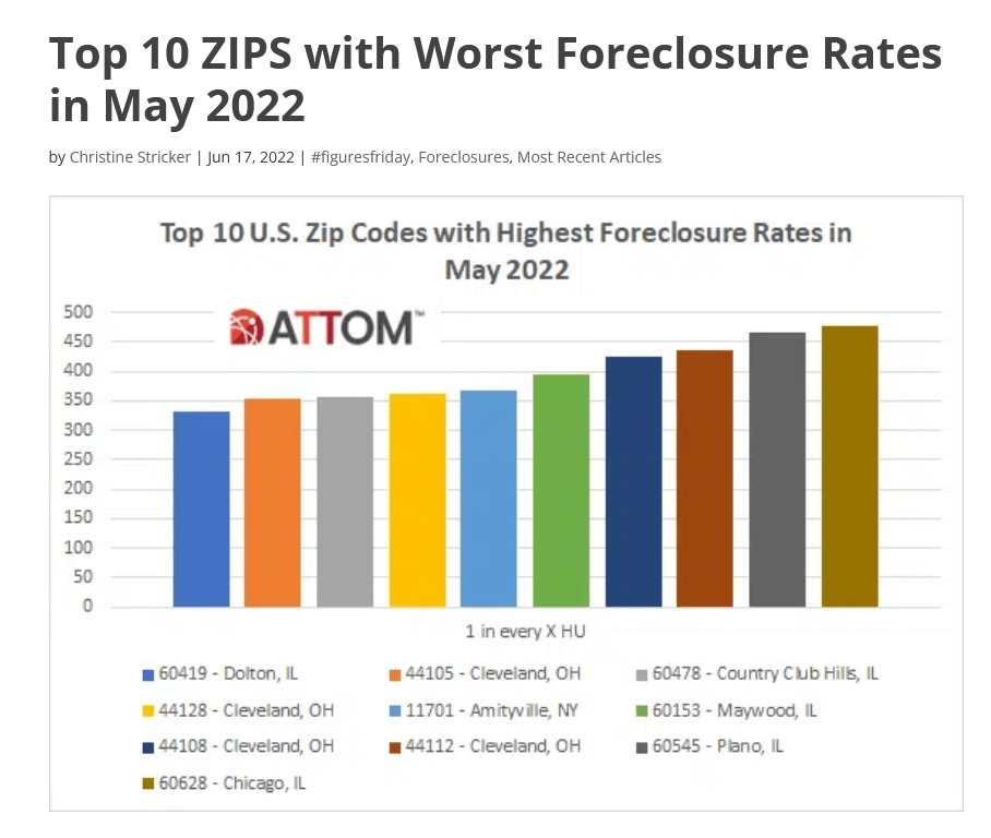 But as The Fed starts to tighten monetary policy after Yellen’s too loose for too long policies followed by Powell, foreclosure rates are soaring in Cleveland. In fact, according to Attom Data, 5 of the top 10 zip codes with the worst foreclosure rates in May 2022 were in Cleveland.