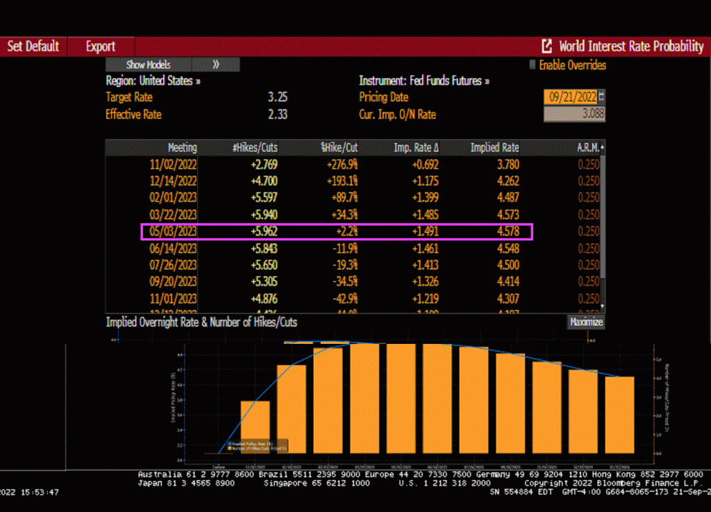 Given the increasing likelihood of a recession, The FOMC’s Dots Project shows The Fed’s target rate increasing to 4.625% in 2023, then gradually declining to 2.5% in the long run.