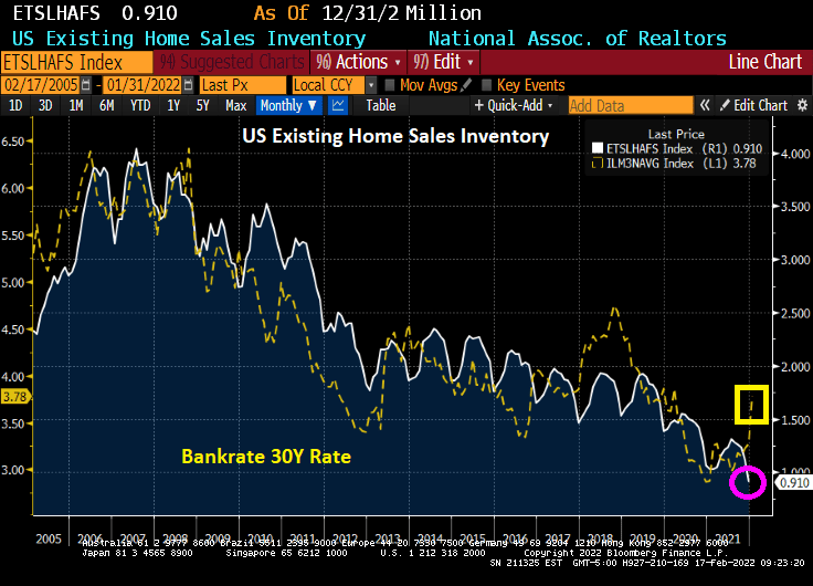 Existing home sales inventory continues to decline as Bankrate’s 30-year mortgage rate starts to climb with expectations of Fed “Shock and Awful.”
