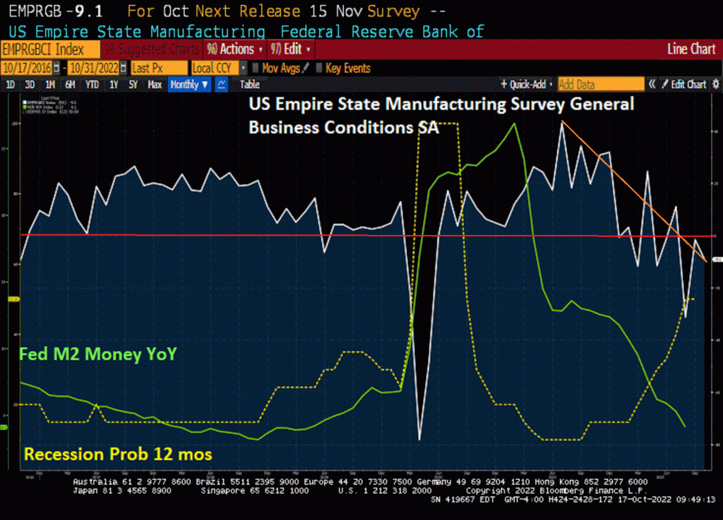 The US Empire State Manufacturing Survey General Business Conditions SA index fell to -9.1 in October, continuing a downward trend along with the downward trend in Fed M2 Money stock growth.