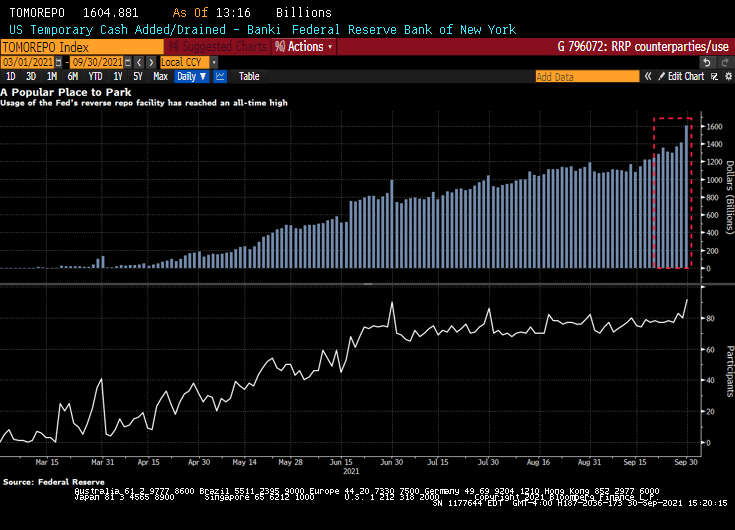 I wonder if Powell is frustrated by banks parking their money at the Fed’s reverse repo facility? Ninety-two participants on Thursday placed a total of $1.605 trillion at the Federal Reserve’s overnight reverse repurchase agreement facility, in which counterparties like money-market funds can place cash with the central bank. The previous record, set the day before, was $1.416 trillion. Thursday’s leap was the biggest one-day increase in usage since mid-June.